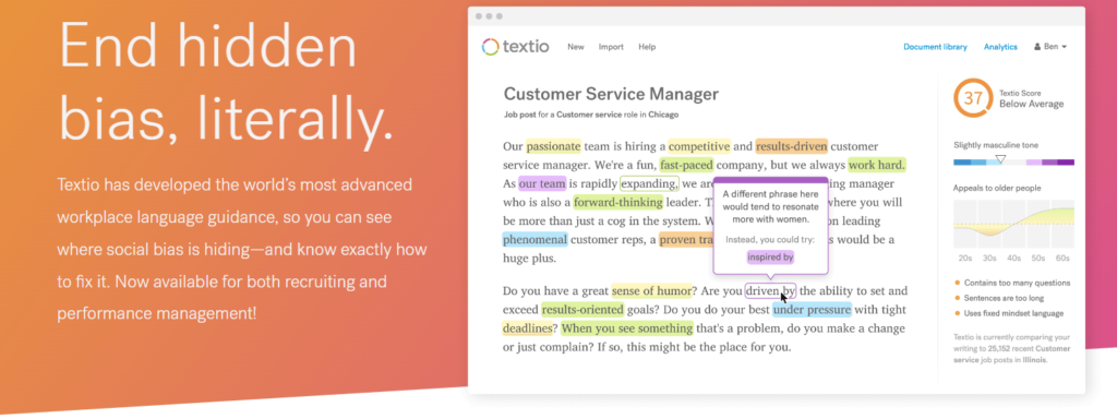 Textio: This AI is used to improve the quality of writing by detecting gender bias, outdated expressions, stereotypes, etc. It is used to write articles, emails, cover letters, etc.
