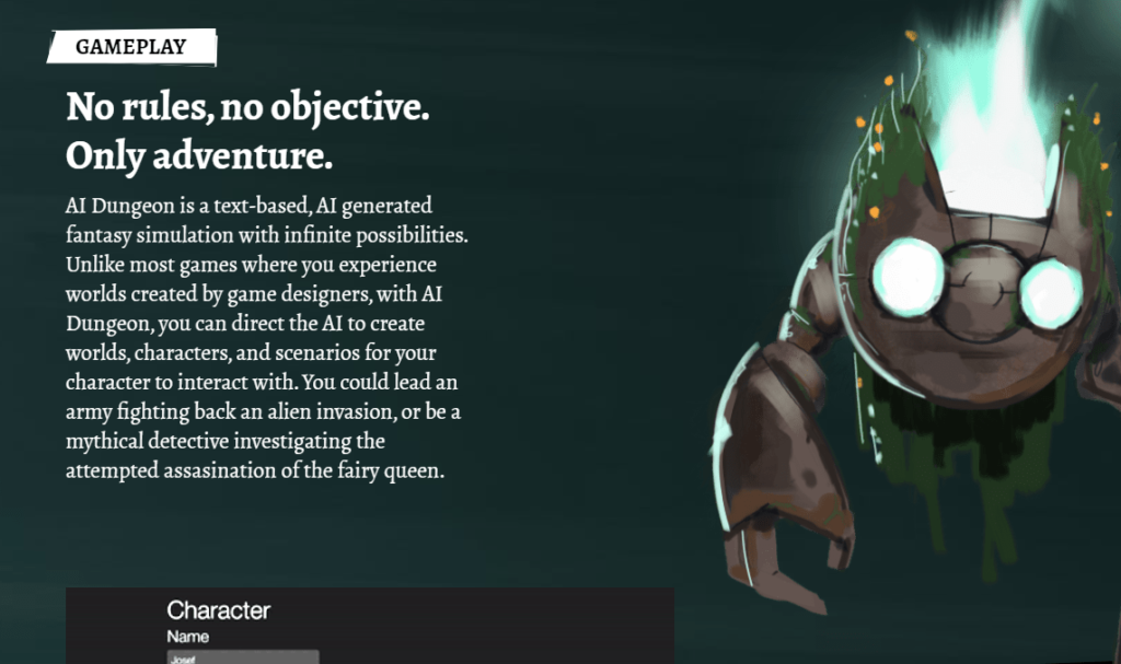 AI Dungeon: This AI is used to generate fictional stories based on instructions given by the user. It is used for content creation, role-playing games, interactive fiction games, and general entertainment content.